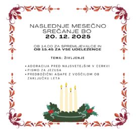 Duhovne vaje v vsakdanjem življenju potekajo od oktobra do maja. Ta krog premišljevanj se začne 16. oktobra in zaključi zadnjo soboto v maju 2026, z romanjem v zahvalo za prejete milosti DVŽ. Srečanja potekajo v dvorani cerkve Kristusovega učlovečenja v...